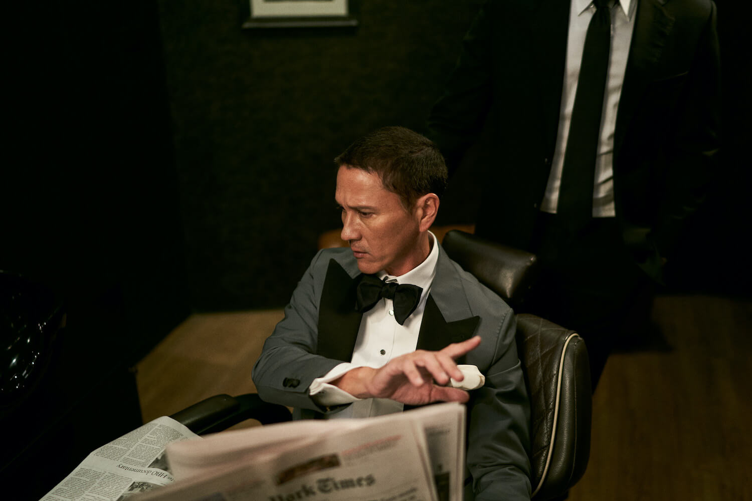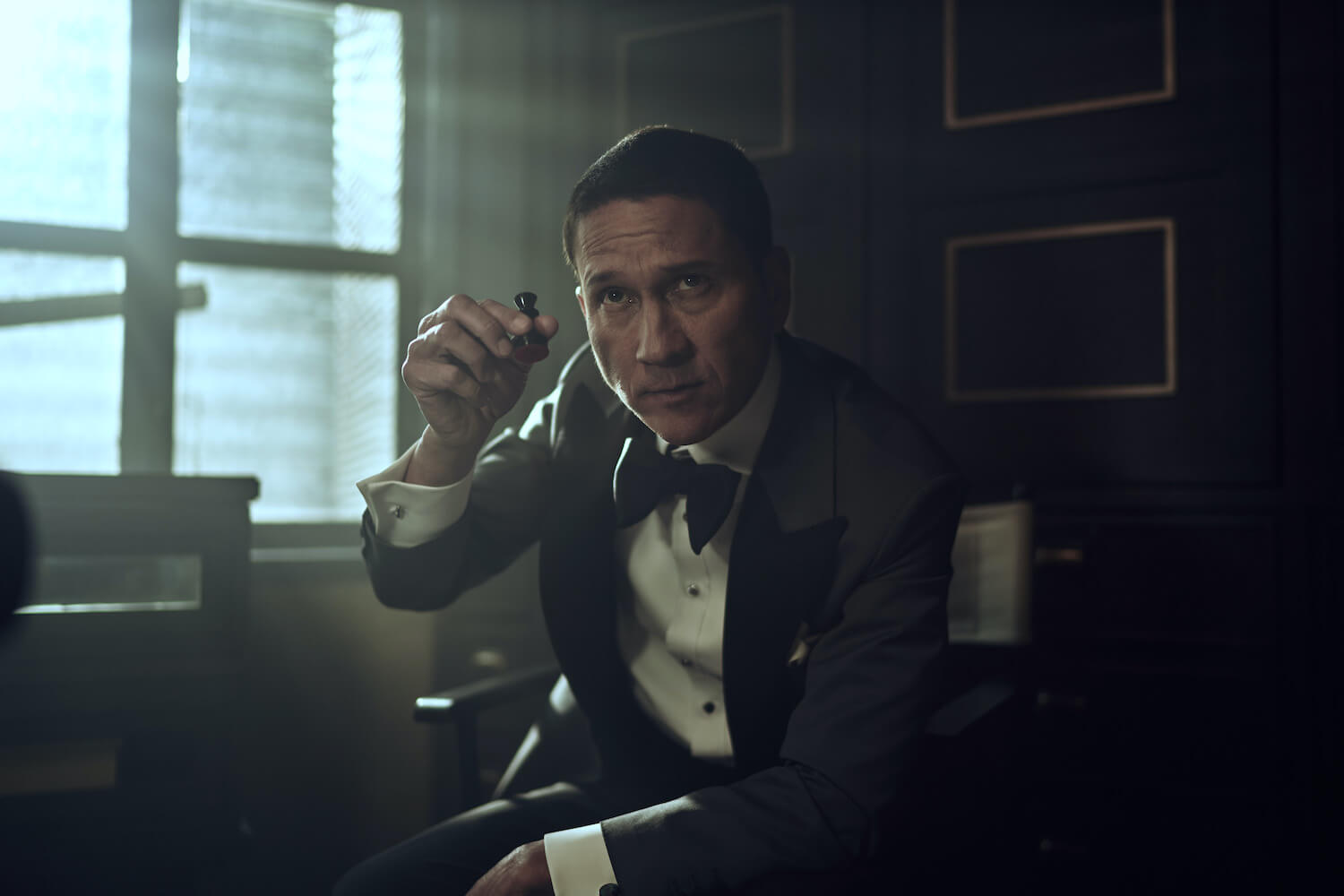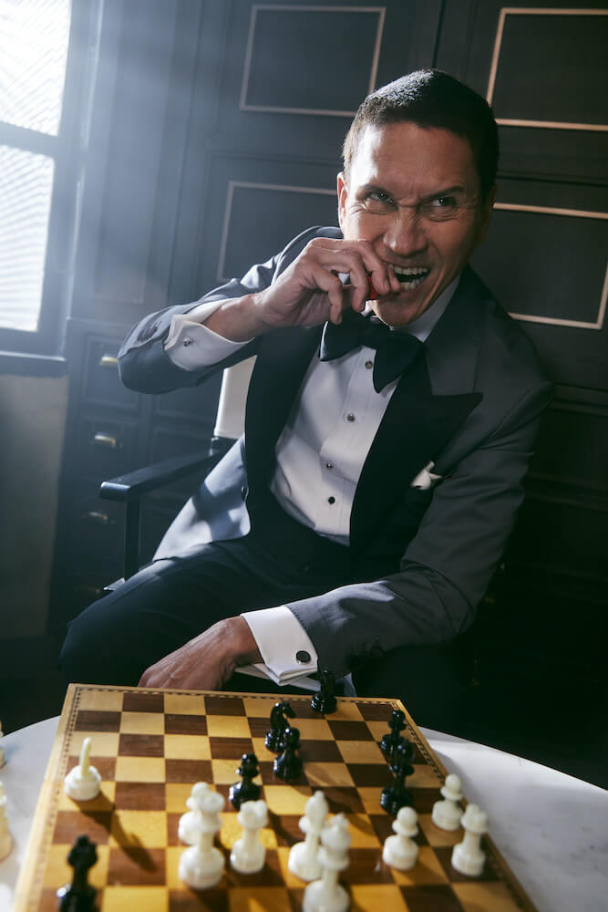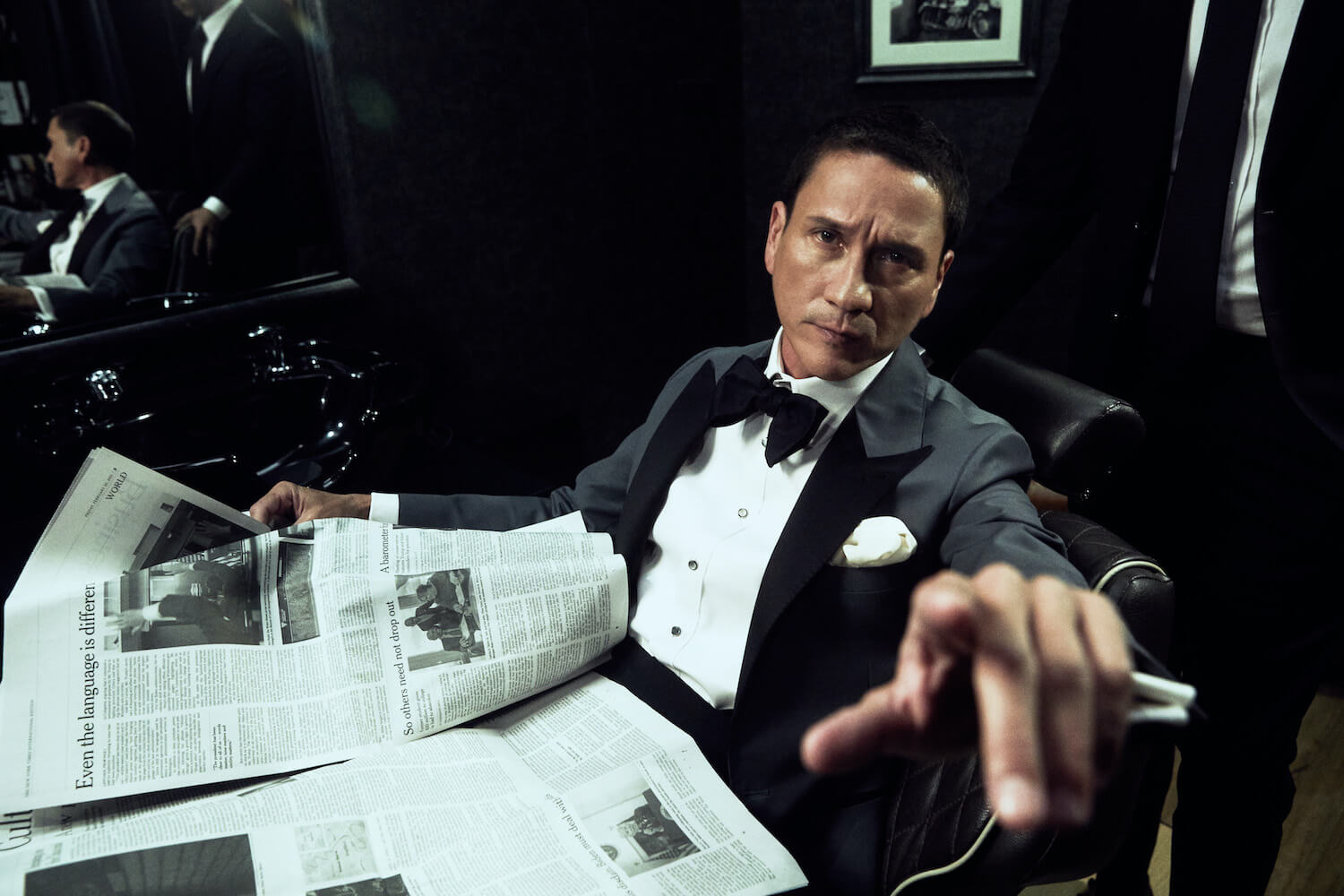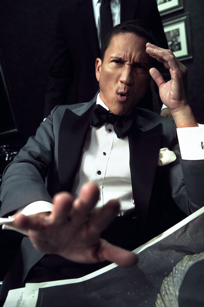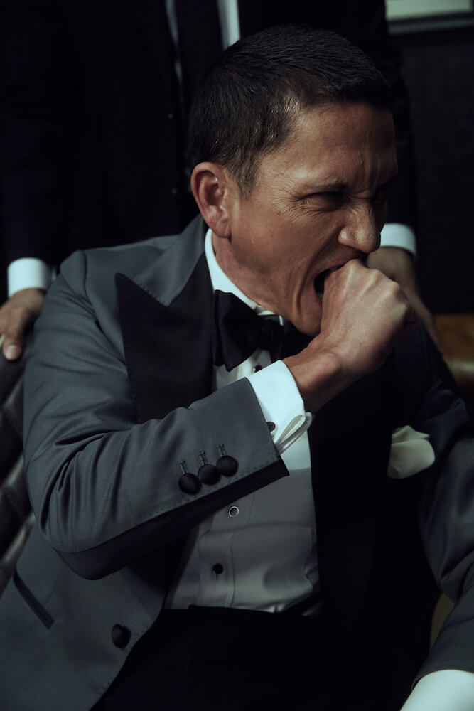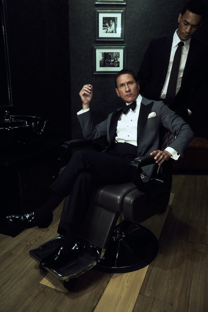 เป็นอีกหนึ่งลุคที่เราเลือกใช้ผ้าอิตาลี จากแบรนด์ Vitale Barberis Canonico (เติบโตมากับแบรนด์นี้) สำหรับตัวเสื้อแจ็คเก็ตเราเลือกใช้ผ้า Worsted Wool ส่วนกางเกงตัดด้วยผ้า Mohair สีดำสนิทที่มีความพิเศษตรงความแน่นของเนื้อผ้าที่ทำให้กางเกงทิ้งตัวสวยตอบรับกับตัวแจ็คเก็ตได้เป็นอย่างดี เราใช้ Bow Tie ของแบรนด์ Serafine Silk เป็นแบรนด์พาร์ทเนอร์จากอิตาลี สำหรับตัวเสื้อเชิ้ตเป็นผ้าซาตินประดับด้วยกระดุมมุก 4 เม็ดบน ตามแบบฉบับความคลาสสิกของ Black Tie ทั้งยังรับกับกระดุมมุกที่แขนเบิ้ลของตัวเสื้อเชิ้ตได้อย่างพอดิบพอดี