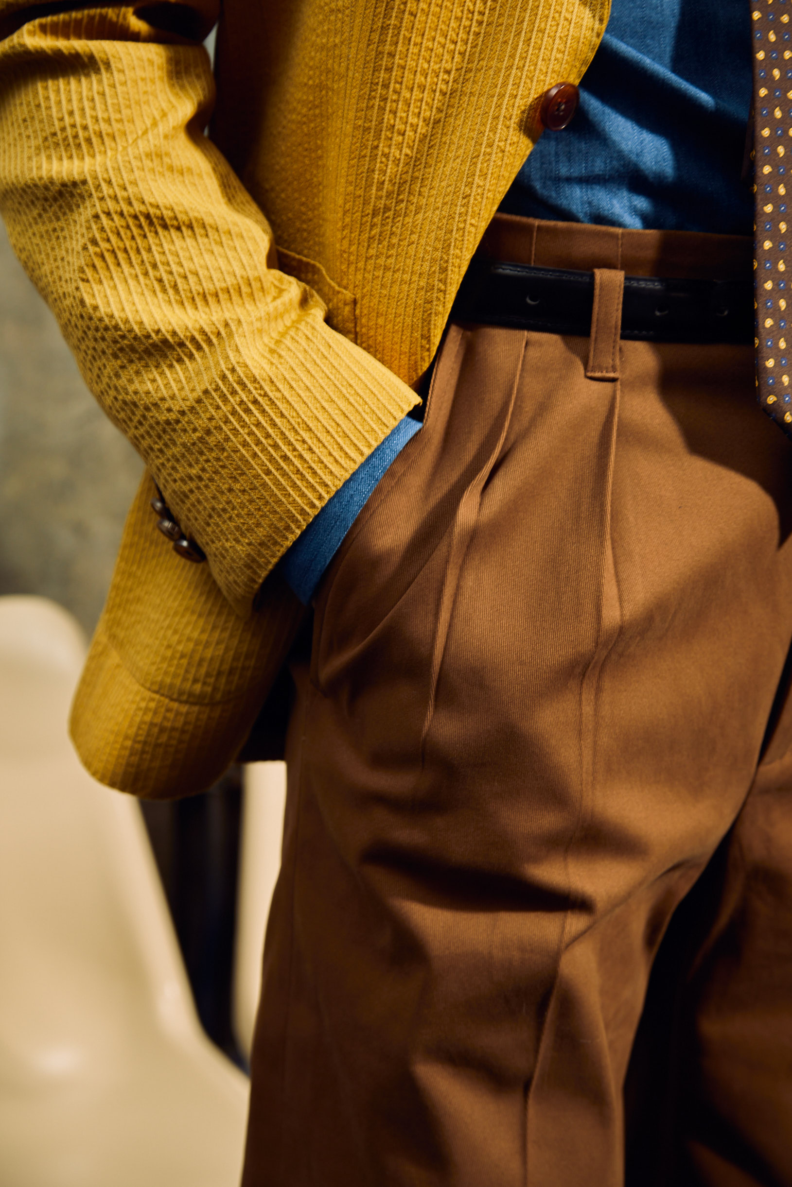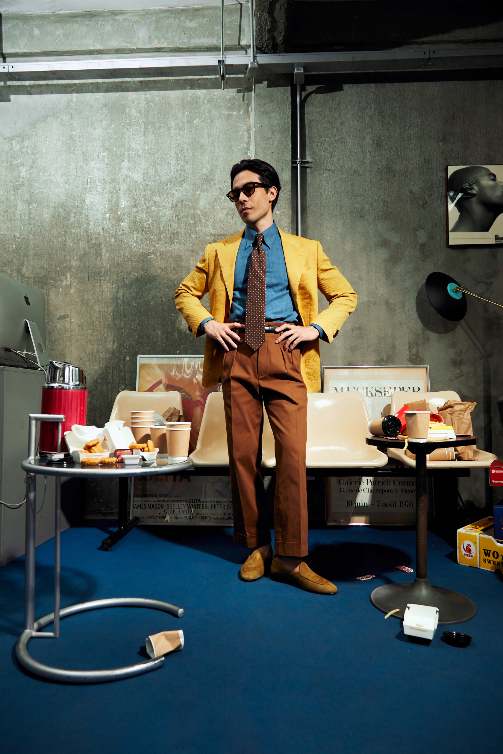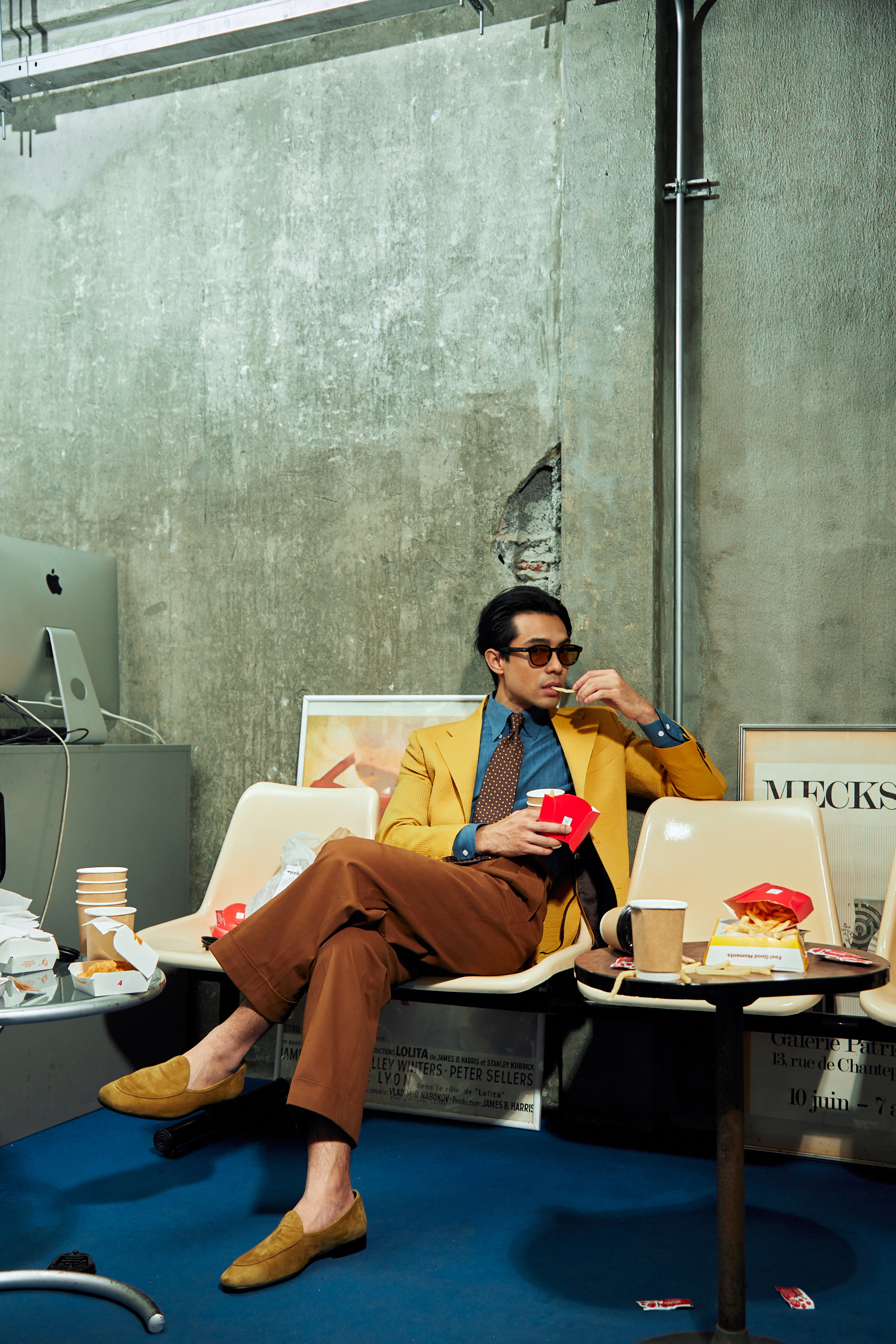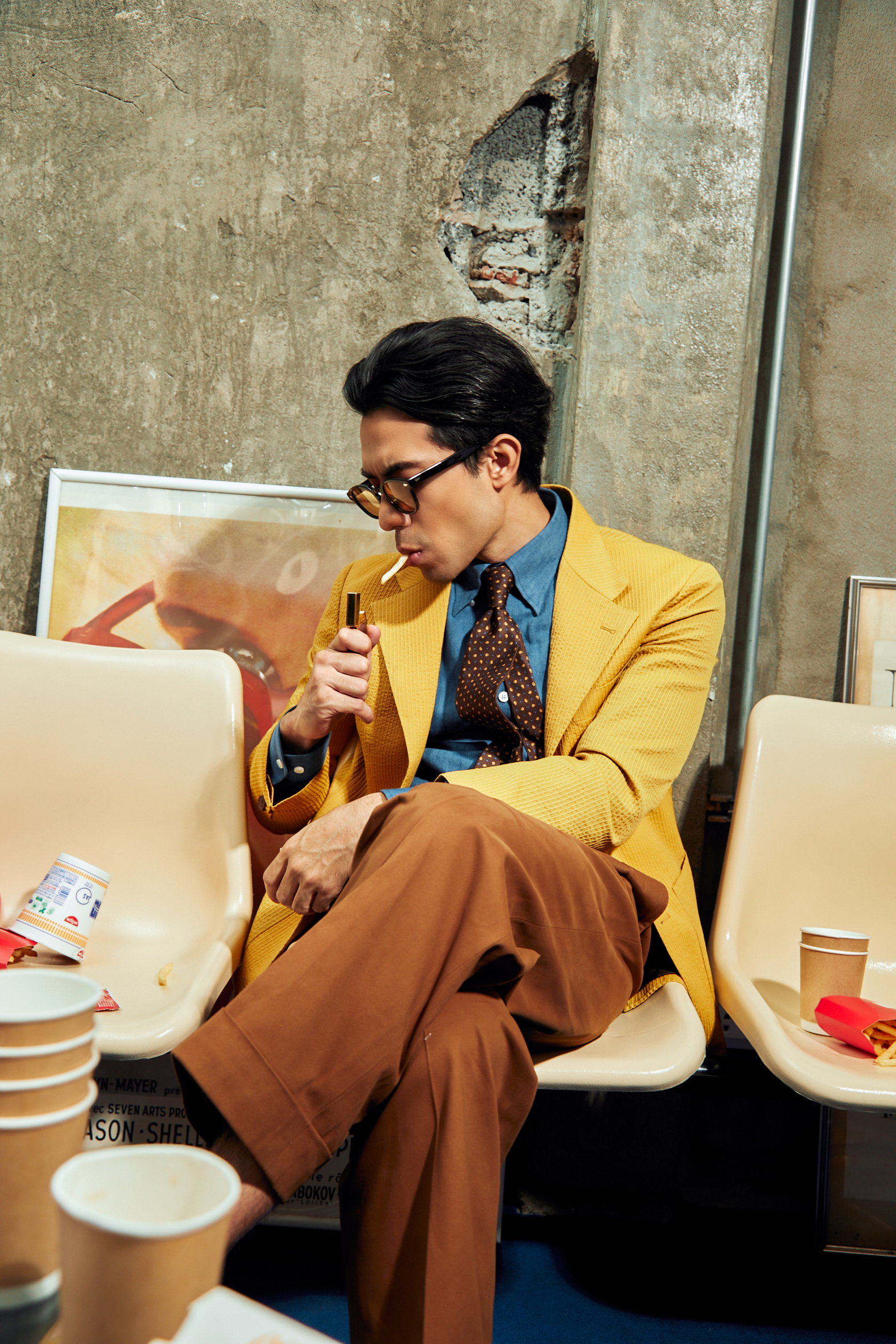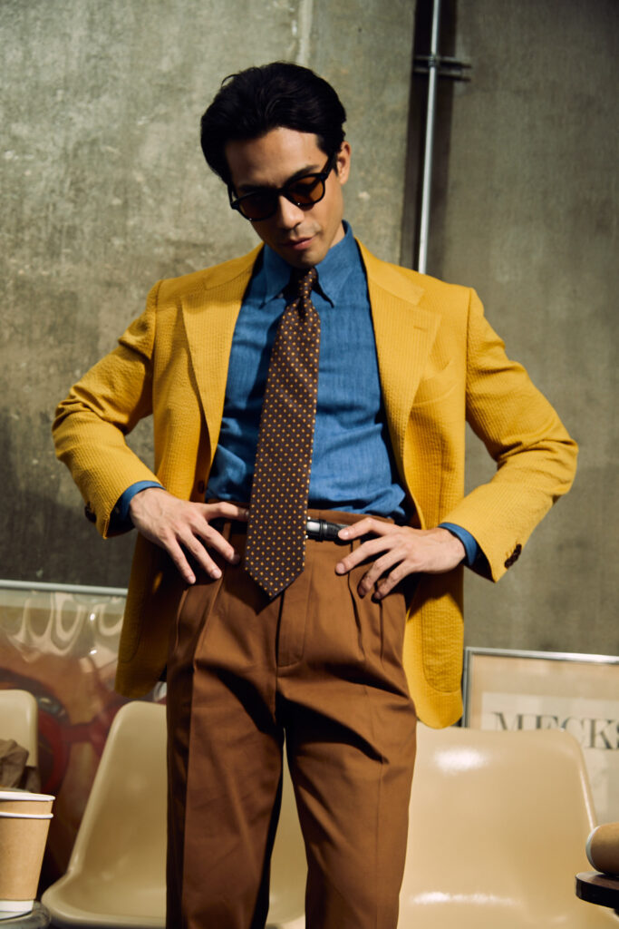 ส่วนจะหล่ออย่างเดียวไม่ได้ มันต้องได้ลุคอ้อนนทีนด้วย แต่งตัวยังไงให้คนทัก สีเหลืองปั่นๆของผ้า seersucker จากผ้าแบรนด์ Drapper เลยต้องเข้าตัดกับเชิ้ตเดนิม แบรนด์ลูกคุณหนูอย่าง thomas mason ก็ต้องมา